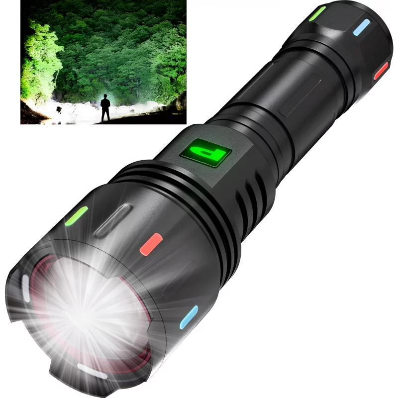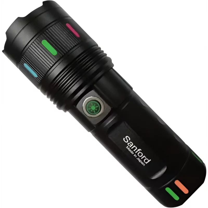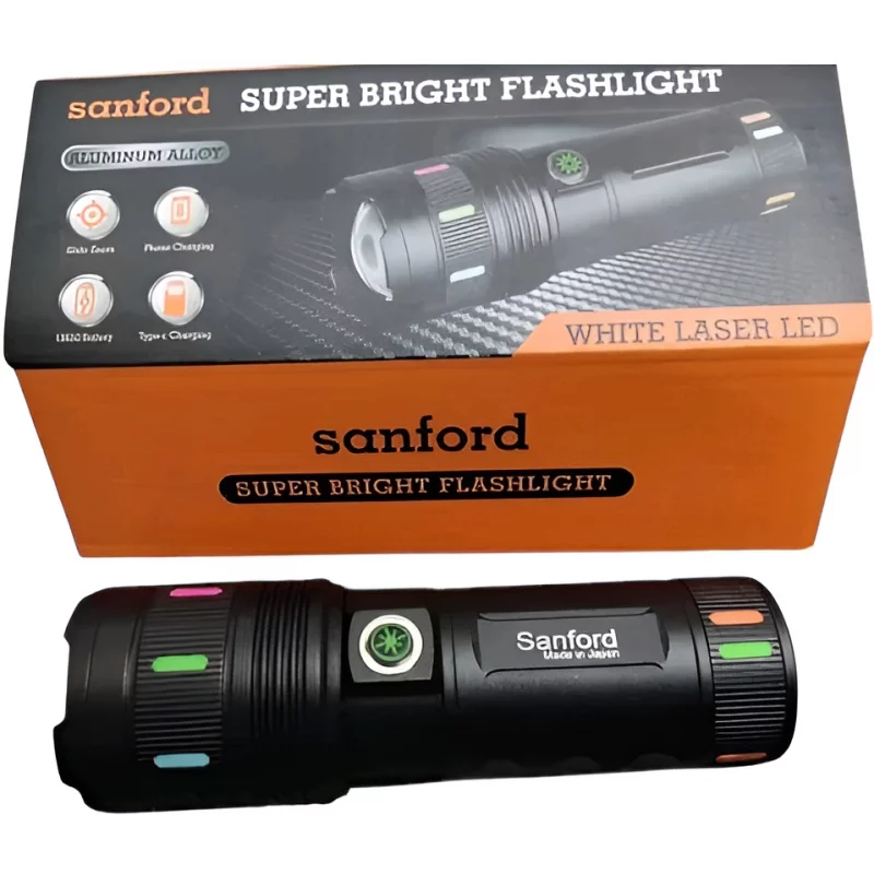 This Sanford SDN07 is a super-bright LED white laser flashlight. It offers a 18650 long battery that ensures long-time charging backup. The torch is equipped with a zoomable focus function and 4 light modes (high, medium, low, and strobe). It has a strong Aluminum Alloy body that is more powerful and sturdy. Moreover, it uses a USB Type-C charging connector, which ensures quick charging.